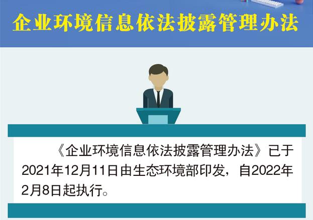 企業(yè)環(huán)境信息依法披露管理辦法  《企業(yè)環(huán)境信息依法披露管理辦法》已于2021年11月26日由生態(tài)環(huán)境部2021年第四次部務(wù)會(huì)議審議通過(guò),現(xiàn)予公布,自2022年2月8日起施行。部長(zhǎng)  黃潤(rùn)秋  2021年12月11日企業(yè)環(huán)境信息依法披露管理辦法第一章 總 則  第一條 為
